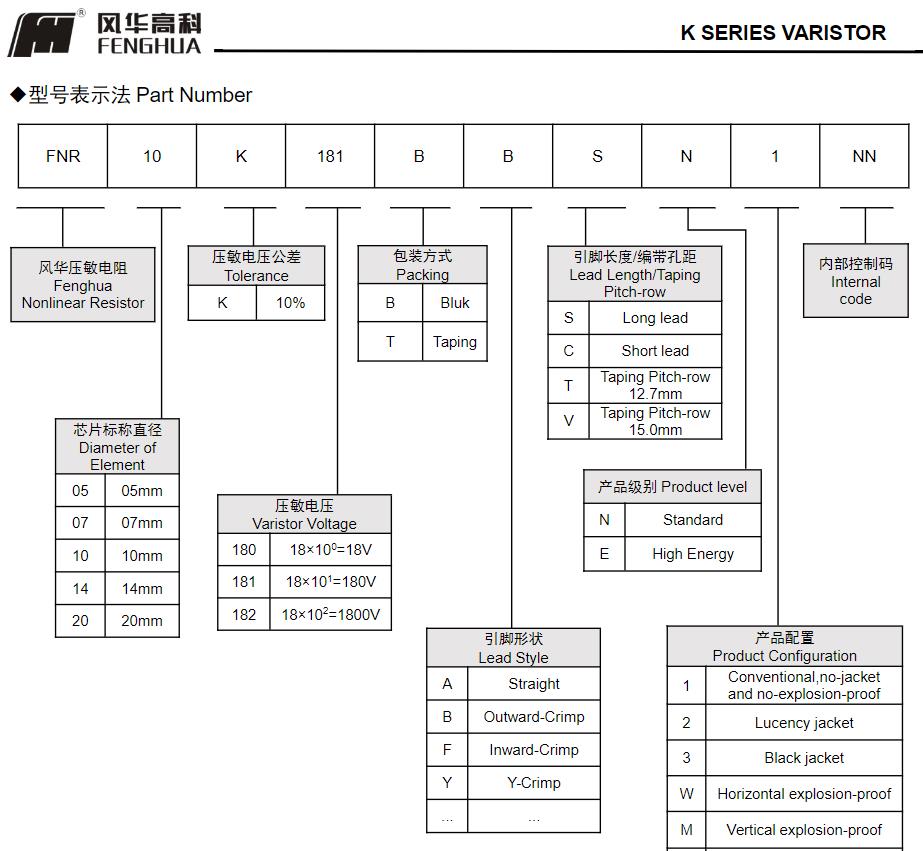 風華高科K系列壓敏電阻器型號命名規則: