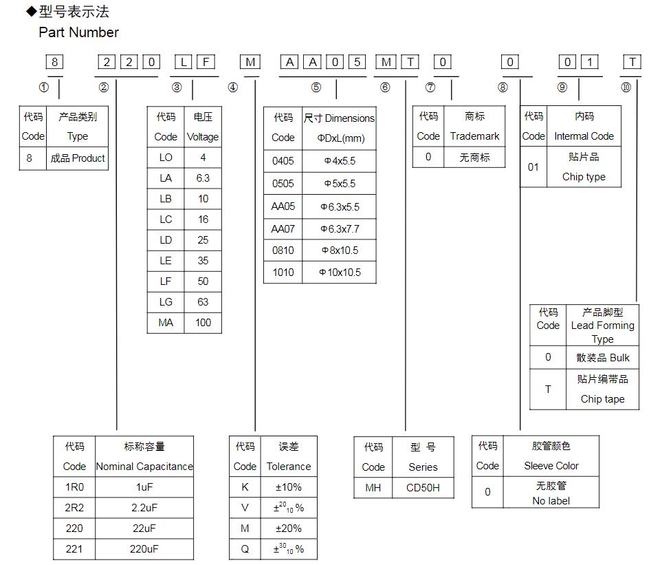 風華高科MH系列鋁電解電容器型號命名規則: