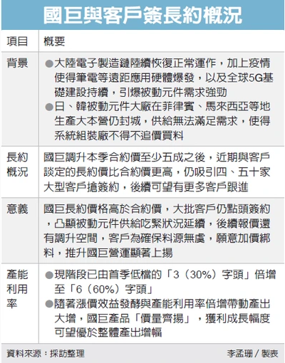 隨著被動元件供應(yīng)仍吃緊,國巨本季漲價效益發(fā)酵與產(chǎn)能利用率倍增帶動產(chǎn)出大增,毛利率、獲利還有上揚空間,營運偏向樂觀,法人正向看待國巨本季營收表現(xiàn),推估季增幅度可達兩成以上,上半年輕松賺逾一個股本無虞。