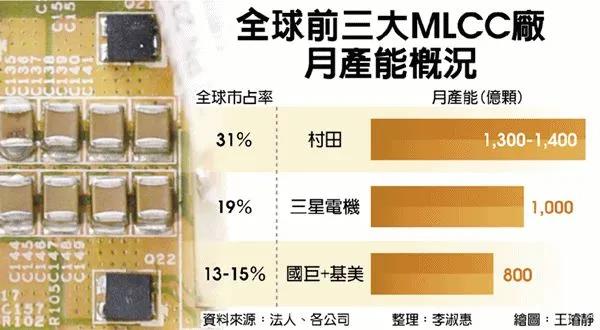 初估大發(fā)新廠滿載稼動之下,兼并估計基美的MLCC產(chǎn)能,新國巨MLCC月產(chǎn)能可望站穩(wěn)1,000億顆,僅越日商村田(Murata)、韓商三星電機(SEMCO),穩(wěn)居寰球第三大廠。