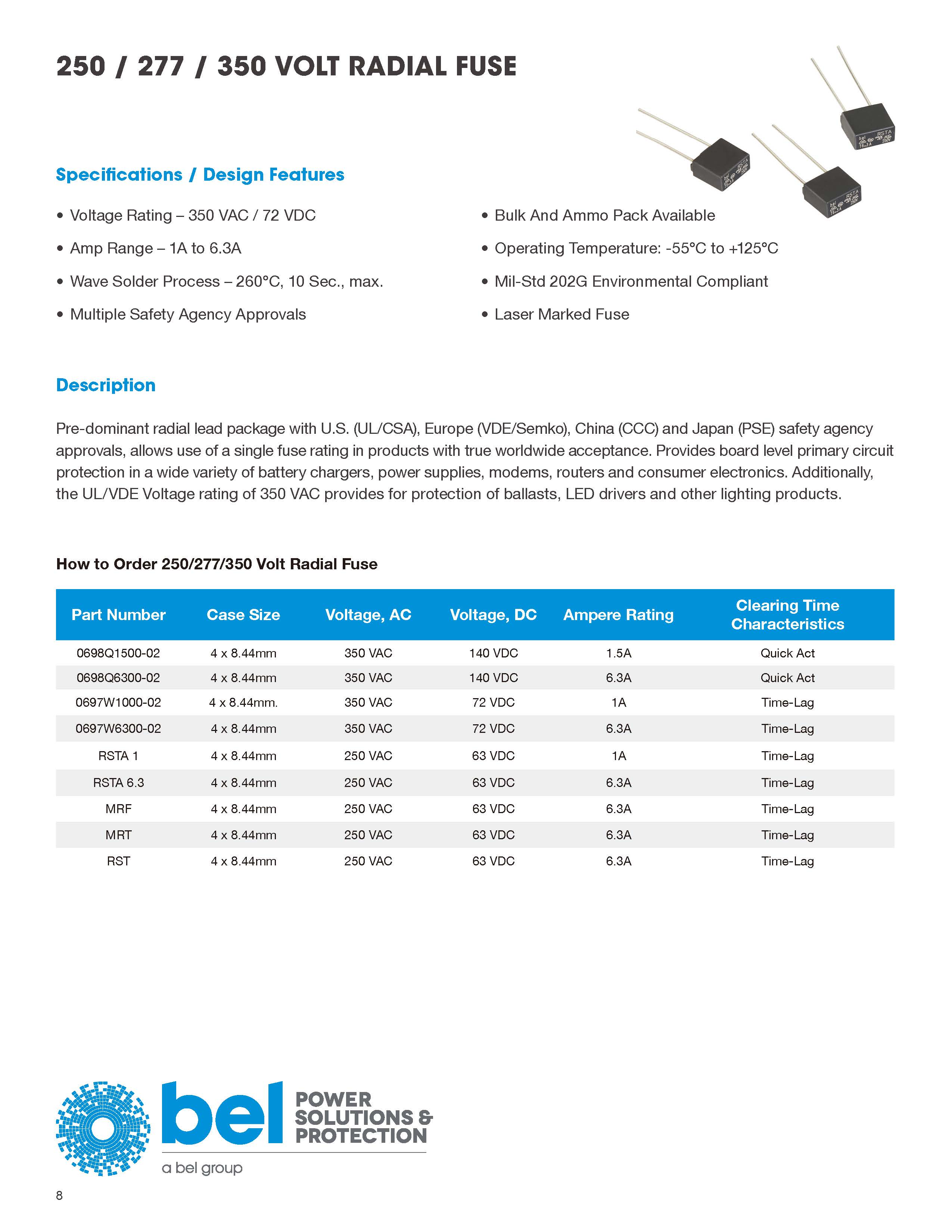 塑料主體和徑向引線保險絲 經(jīng)美國(UL / CSA),歐洲(VDE / Semko),中國(CCC)和日本(PSE)安全機構(gòu)批準(zhǔn),允許在真正被全球接受的產(chǎn)品中使用單個熔斷器額定值。在各種電池充電器,電源,調(diào)制解調(diào)器,路由器,消費類電子產(chǎn)品等中提供板級主電路保護。
