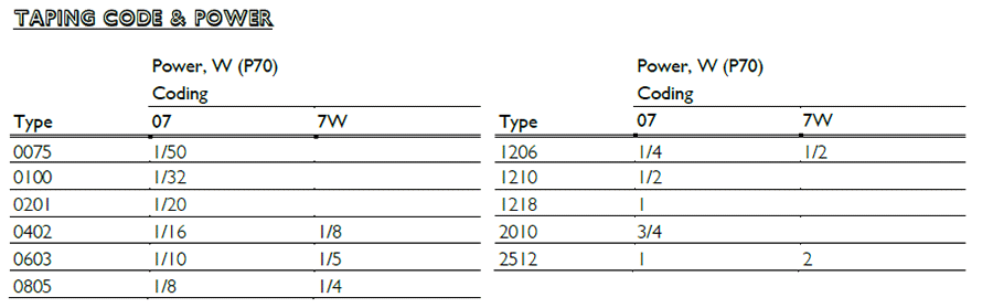 產品功率:1/50W;1/32W;1/20W;1/16W;1/10W;1/8W;1/5W;1/4W;1/2W;3/4W;1W;3W