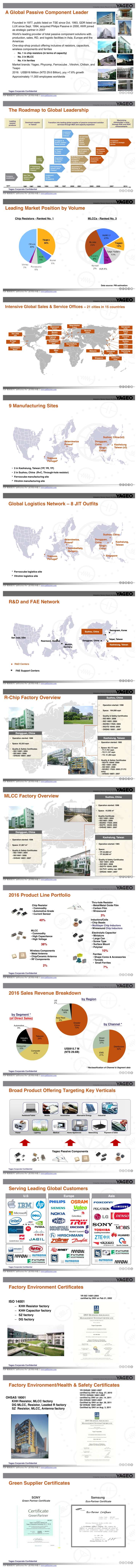 國巨現(xiàn)今為全球第一大芯片電阻器 (R-chip) 制造商、全球第三大積層陶瓷電容 (MLCC) 供貨商,在磁性材料 (ferrits) 領域則名列全球第三。國巨目前在全球18個國家有27個行銷/服務據(jù)點、8座生產基地、5座 JIT即時發(fā)貨中心,及3個研發(fā)中心。位于歐洲的飛磁(Ferroxcube) 和 Vitrohm 也隸屬于國巨集團,分別以生產磁性材料和傳統(tǒng)電阻為主。
