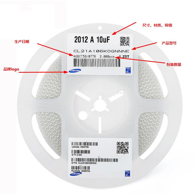 三星電容標簽圖解:三星電容型號命名規則:例如:CL 21 A 106 K O Q 8 N N N E 1 2 3 4 5 6 7 8 9 10 111 系列編碼CL=積層陶瓷電容2 尺寸編碼03=0201(0603)&nb