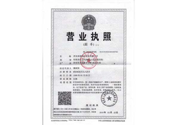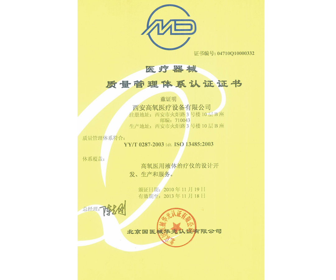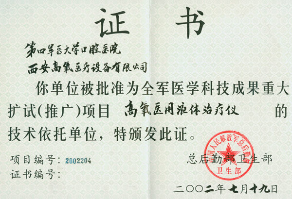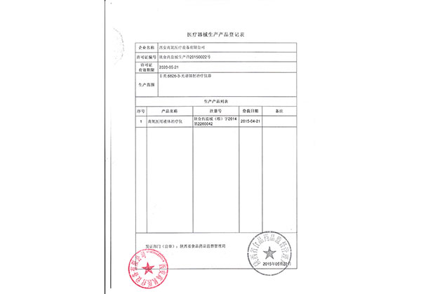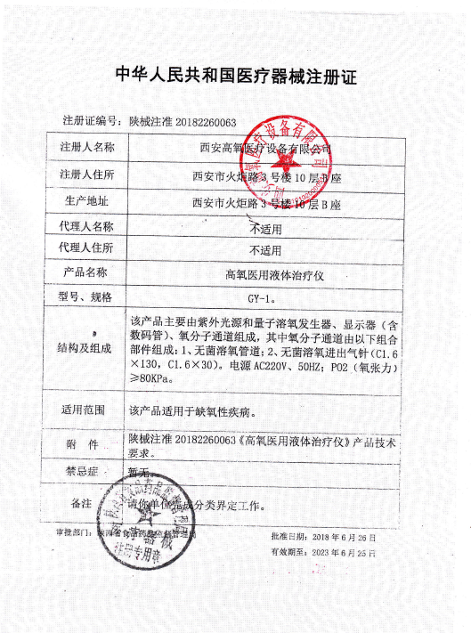 高氧醫(yī)用液體治療儀依托單位證書